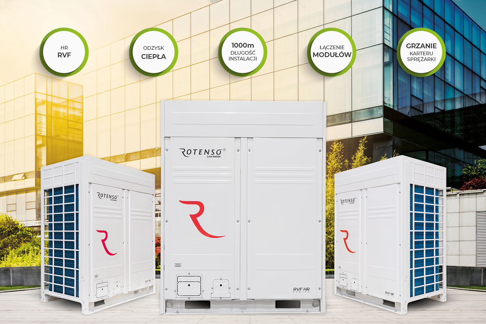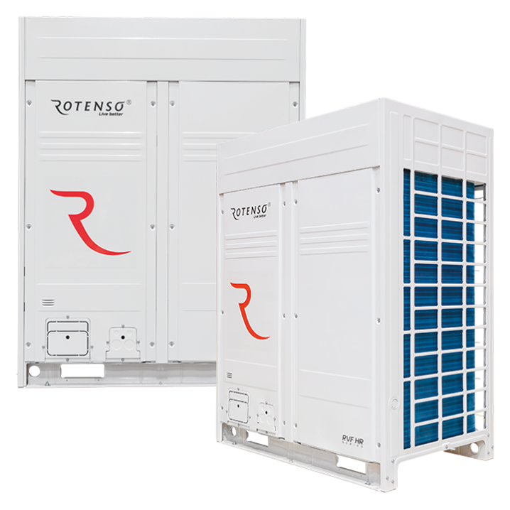 “HR RVF Rotenso®” – tai 3 vamzdžių oro kondicionavimo sistema su rekuperacija, kuri gali efektyviai atlikti vėsinimo ir šildymo funkcijas nepriklausomai kiekvienoje patalpoje tuo pačiu metu. Šie sprendimai pagrįsti efektyviais lauko įrenginiais su vertikaliu oro išleidimu, kurių išdėstymas, moduliniu būdu sujungiant kelis įrenginius, nereikalauja didelių atstumų, o tai svarbu esant ribotai erdvei.