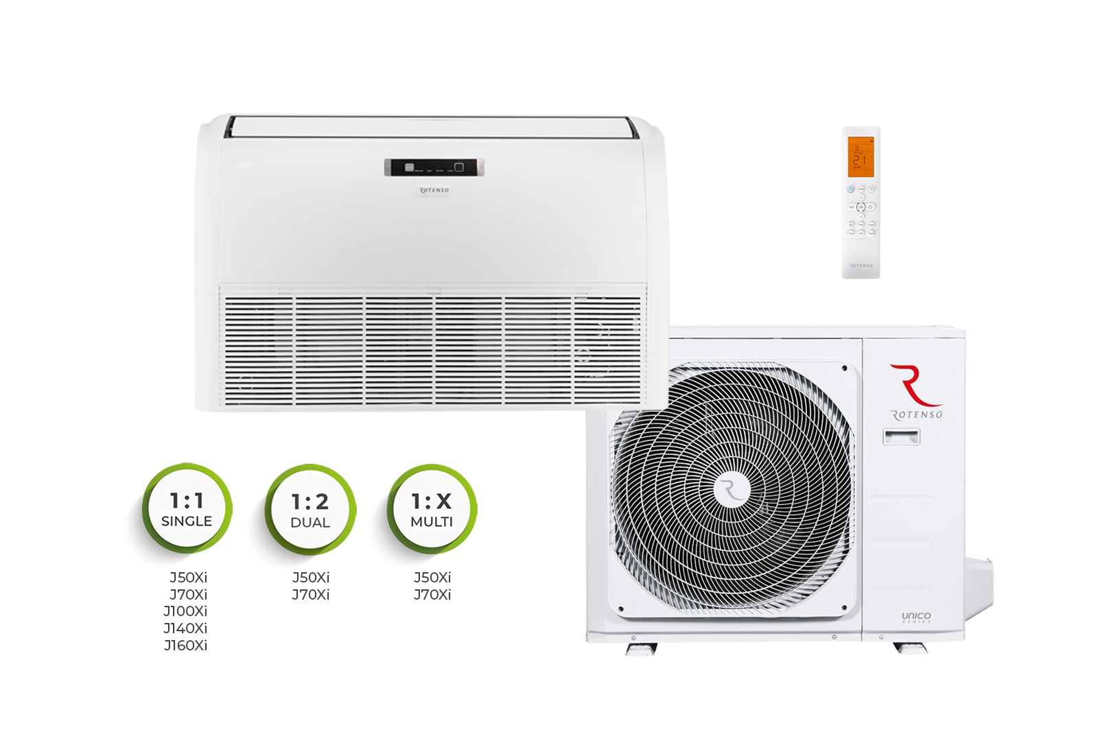 “Rotenso® Jato” oro kondicionierius nuo grindų iki lubų yra universalus įrenginys, kurį galima montuoti tiek ant sienos (vertikaliai), tiek ant lubų (horizontaliai). Jį galima įsigyti septynių galingumų (nuo 5,3 kW iki 15,8 kW) ir A++ vėsinimo klasės. “Jato” oro kondicionierius pasižymi efektyviu, didelio nuotolio tiekiamo oro diapazonu, todėl juo galima vėsinti dideles patalpas (pvz., konferencijų ir banketų sales, laukiamuosius, klientų aptarnavimo patalpas). Paauksuotos briaunos padidina įrenginio efektyvumą ir veiksmingai apsaugo oro kondicionierių nuo korozijos.