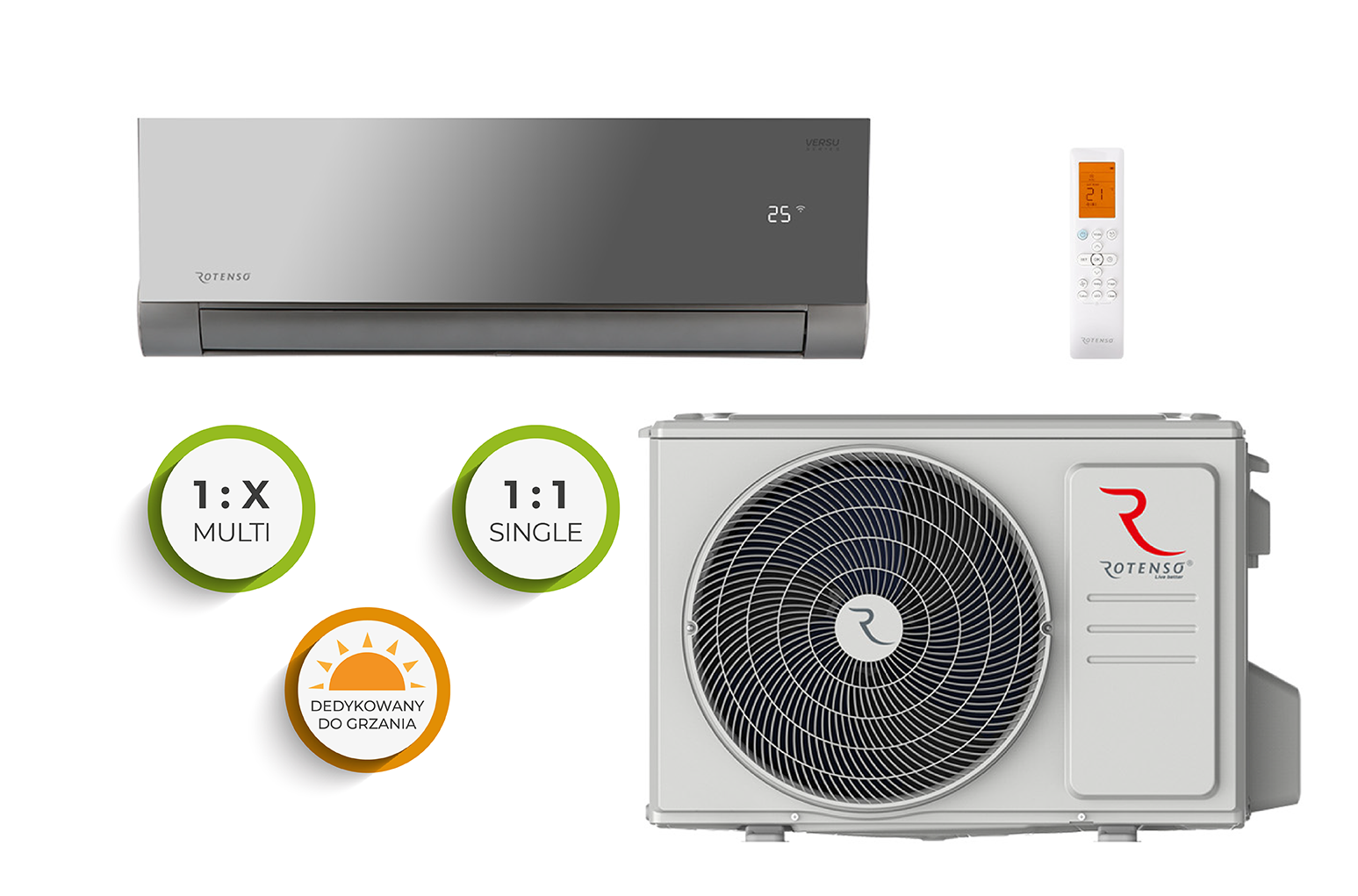 “Rotenso® Versu Mirror” oro kondicionierius skirtas klientams, vertinantiems modernų dizainą. Grafitinė spalva ir veidrodinis skydelis pabrėžia įrenginio prestižą ir puikiai dera prie bet kokio interjero.