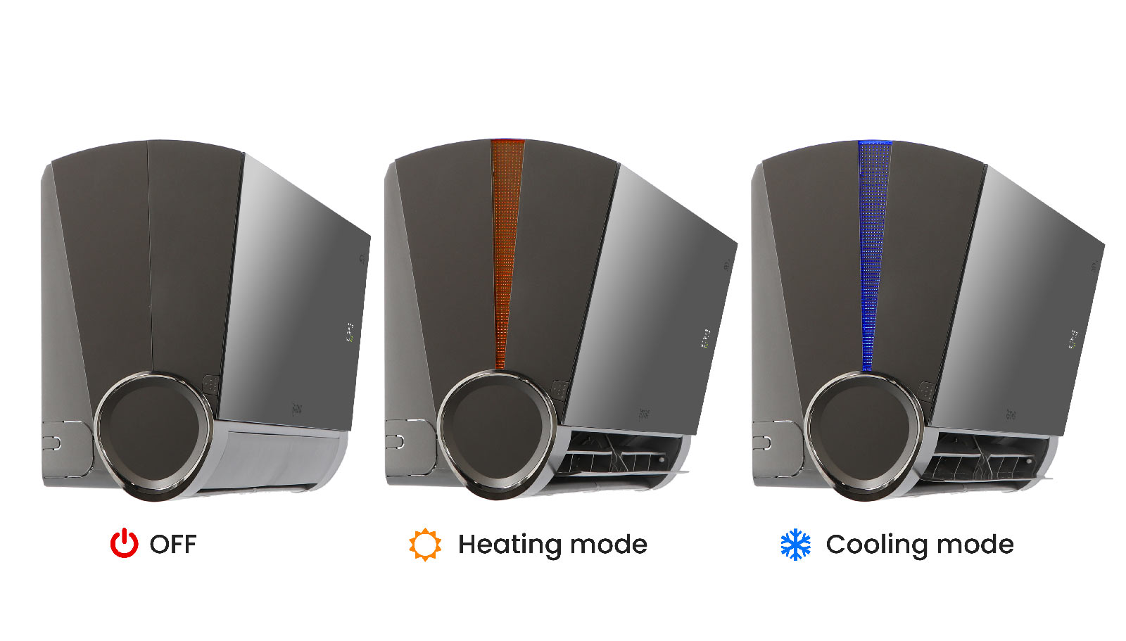 Prabangų “Versu Mirror” charakterį dar labiau sustiprina subtilus foninis apšvietimas – mėlynas vėsinimo režimu, oranžinis šildymo režimu.